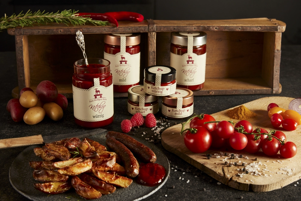 Schon Oma Mia sagte “Es gibt nichts besseres als Selbstgemachtes!”. Nach diesem Grundsatz wird im beschaulichen Dorf Muschenheim bei Lich der leckere „Zum Heiligen Stein“ Ketchup hergestellt. Der Ketchup in den drei Geschmacksrichtungen mild, würzig und scharf ist eine wahre Delikatesse und bereichert das abwechslungsreiche Saucensortiment der Märkte von Tom Kutsche um eine interessante wie hochwertige Facette.